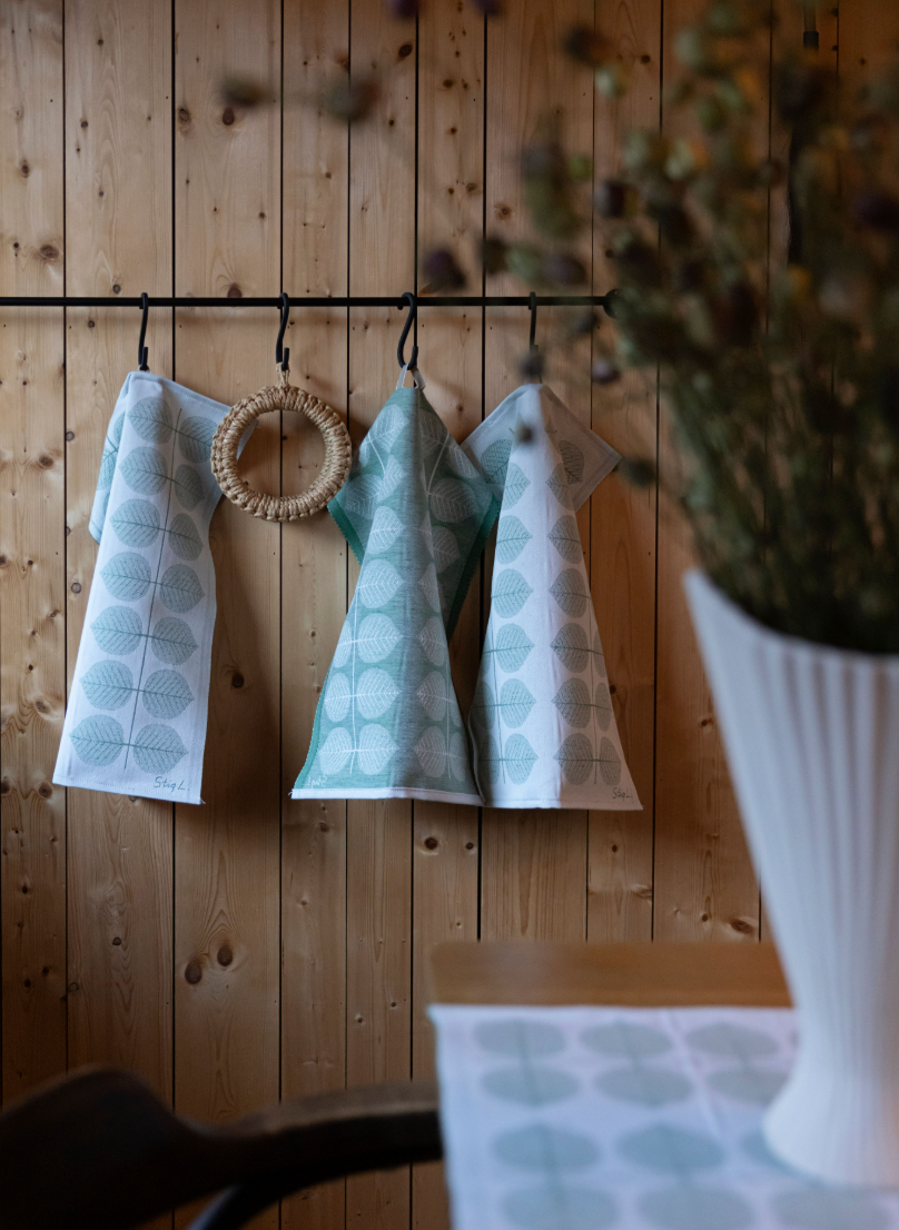 Se all sizes >This design is instantly recognizable for its repeating motif of green, birch tree leaves arranged in a symmetrical pattern against a white background. The simplicity and freshness of the design capture the essence of Scandinavian modernism.