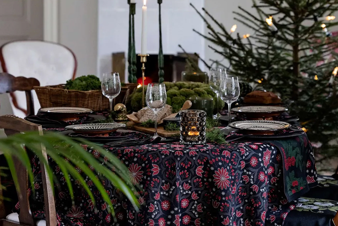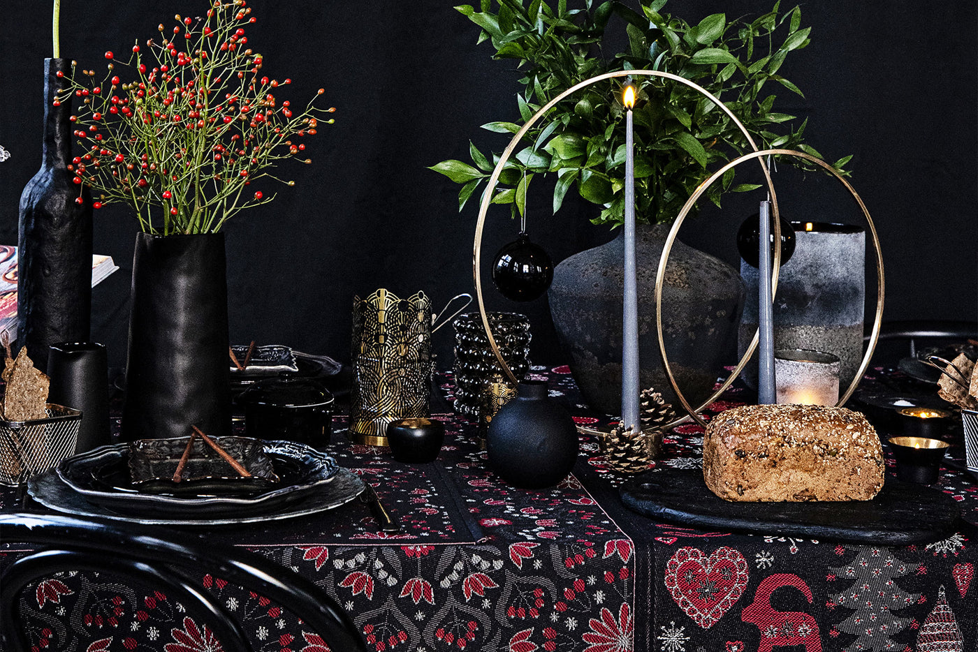 Klassische schwedische Weihnachtsmuster auf schwarzem Hintergrund sorgen für einen ausdrucksstarken Festlook. Kombinieren Sie sie als Kontrast mit einer weißen Tischdecke wie Åtteblad – oder setzen Sie ganz auf Schwarz und ergänzen Sie mit „Bettys Jul“.