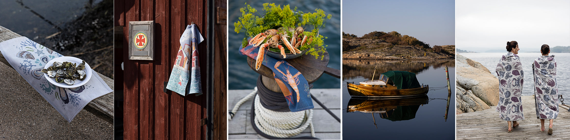 Med mönster som påminner om vindpinade båthus, robusta fiskeredskap och havets läckerheter speglar kollektionen den enkelhet och styrka som genomsyrar kustlivet.